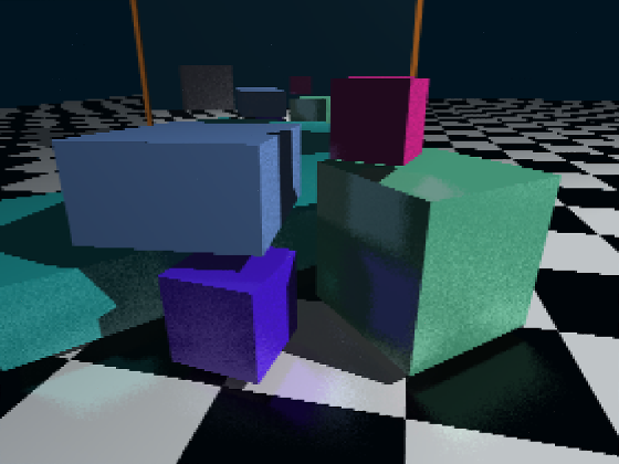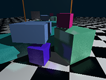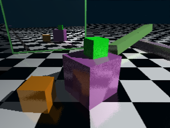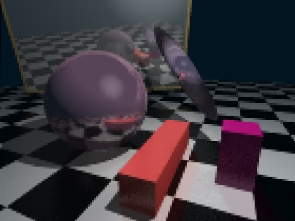 Once I had reflections, I began experimenting with diffused reflections. I remembered from when I first read about raytracers that diffused reflections were due to imperfections along the surface of an object, causing light to scatter in all directions. This is why, on some shiny objects, the reflected image is very blurry. I implemented my diffused reflections by having light, when it reflects, jitter off in a random direction. Since this would make many objects look very rough, I smoothed out the image by adding full-screen anti-aliasing.